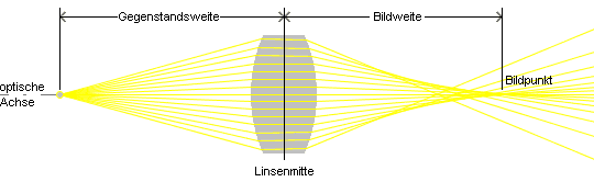 Die Gegenstandsweite ist die Entfernung vom Objektpunkt zur Mitte der Linse, die Bildweite die Entfernung von der Mitte der Linse zum Bildpunkt. Der Bildpunkt ist der Ort der engsten Einschnürung des gewandelten Bündels. Verwechsle Bildpunkt, Brennpunkt und Brennweite nicht! | ||||||||||||||||||||