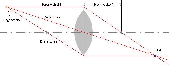 | Wie oben schon angedeutet wurde, bestimmt diese Konstruktion den Ort des Bildes nur näherungsweise. Sie gilt auch nur für dünne Linsen und Objekte, die nicht weit von der |