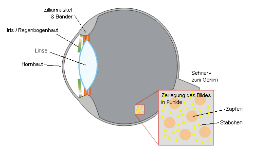 Unser Auge benutzt eine Sammellinse, um die Gegenstände scharf auf die Netzhaut abzubilden. Dort sitzen die Zapfen und Stäbchen, die das Bild in viele Punkte zerlegt aufnehmen und die Informationen über den Sehnerv zum Gehirn weiterleiten. Eigentlich steht das reelle Bild der Gegenstände um uns herum auf dem Kopf - unser Gehirn dreht die Informationen wieder um, so dass wir die Umwelt richtig herum wahrnehmen.