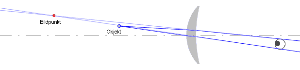 Bisher war immer das von der Linse selektierte Lichtbündel gezeichnet. Nach der Wandlung trifft aber nur ein kleiner Teil des gewandelten Bündels in das Auge. Daher ist es sinnvoller, nur das Bündel zu zeichnen, das nach der Linse auch in das Auge fällt. Dazu zeichnest du am besten die beiden Strahlen, die das Bündel begrenzen - genau so, wie in den beiden Erklärungen der Sehfehler oben.